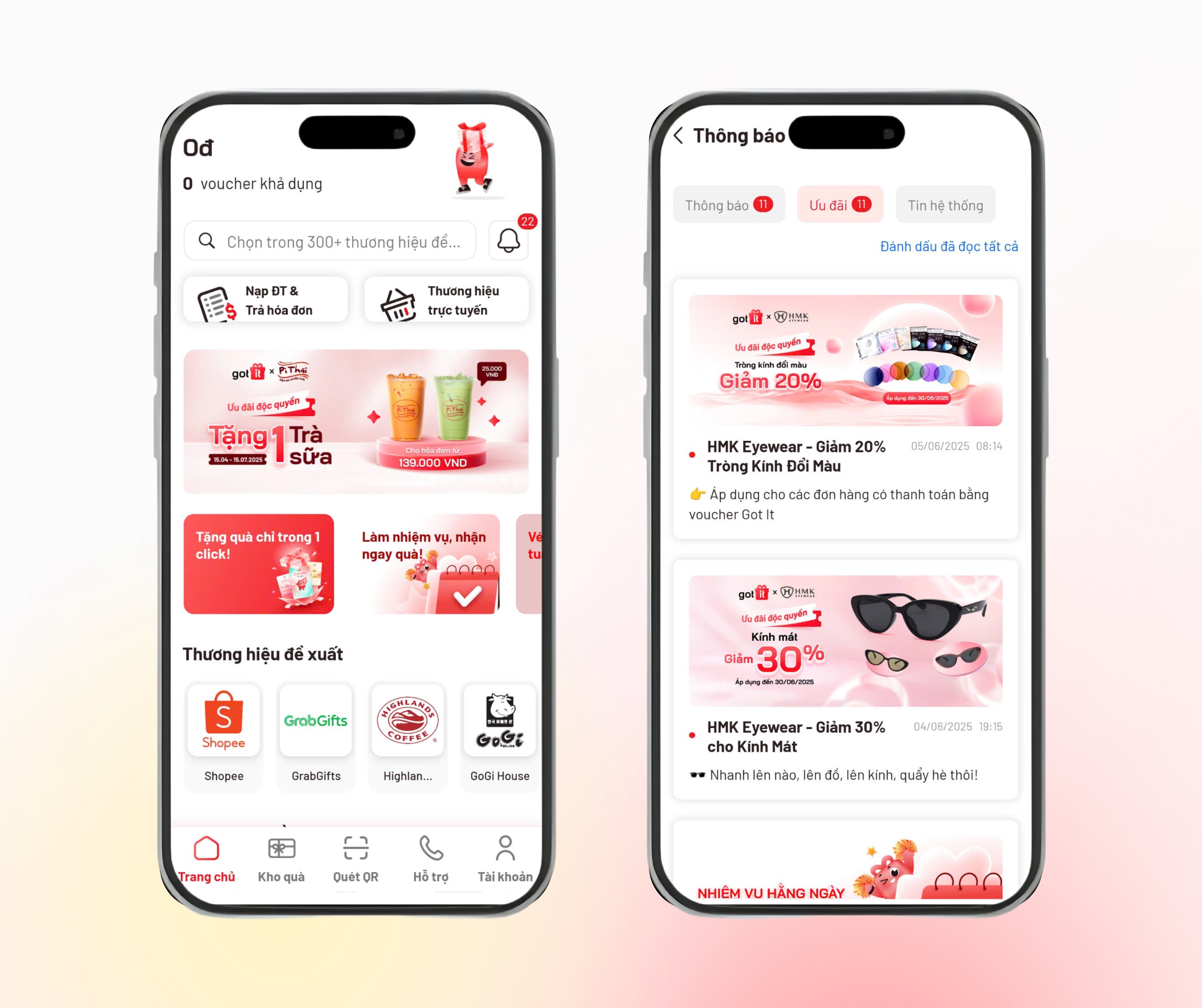 Chỉ cần mở app và hoàn thành nhiệm vụ, bạn đã có thể dễ dàng rinh voucher đến từ hơn 300+ thương hiệu đối tác của Got It.